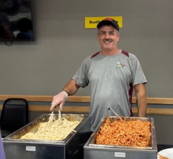 Tom Lester from Basilleo’s Pizza dishes up some his delicious pasta at the Taste of Steele County.
